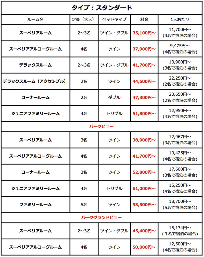ディズニーアンバサダーホテル 2016年度の料金表と客室カレンダー